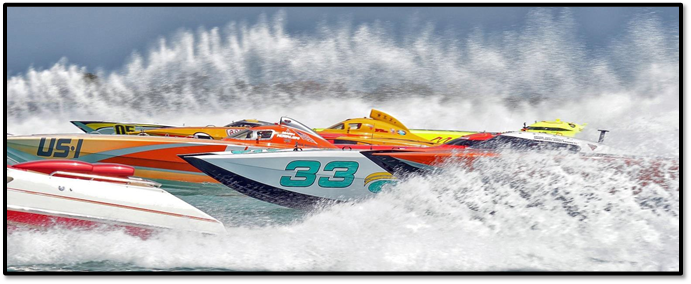 Many international race boats are joining in, Qatar (#13 Qatar), Norway (#99 Gasse), and Dubai (#3 Fazza), to take on the likes of #113 Miss GEICO and many others, including #77 Lucas Oil SilverHook, driven by Michael Silfverberg and throttled by Nigel Hook, who are stepping up to the Superboat Unlimited Class.